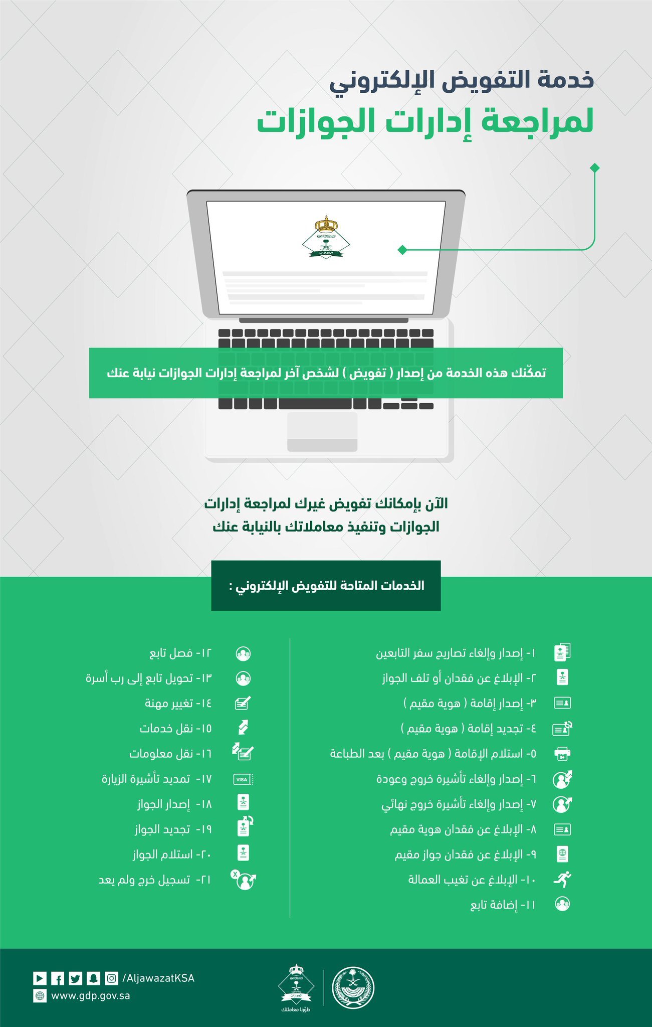 استلام الجواز بعد التجديد. يتم تحديث جواز السفر بعد التجديد من قبل المقيمين في المملكة العربية السعودية وهو من الخدمات الإلكترونية التي تقدمها وزارة الداخلية عبر الإنترنت كما تعمل الوزارة على تقديم العديد من الخدمات الإلكترونية المتعلقة. يتم نقل معلومات من جواز السفر القديم للوافد لجواز جديد عن طريق توجه الوافد إلى سفارة بلده وبعدها يتم إجراء عملية النقل من خلال منصة أبشر وذلك ضمن إشراف كامل من قبل إدارة الجوازات. خطوات إصدار أو تجديد الجواز من منصة أبشر 1 الدخول في خدمة أبشر. تحديث جواز السفر بعد التجديد.