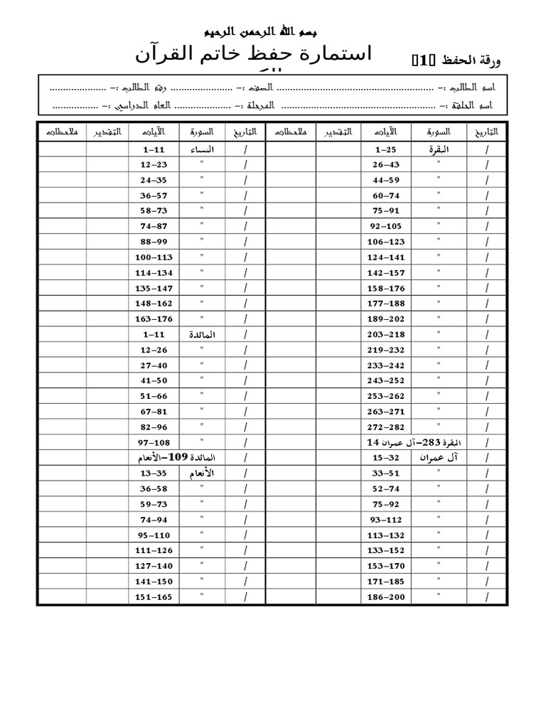 استمارة متابعة حفظ ومراجعة القرآن الكريم Doc