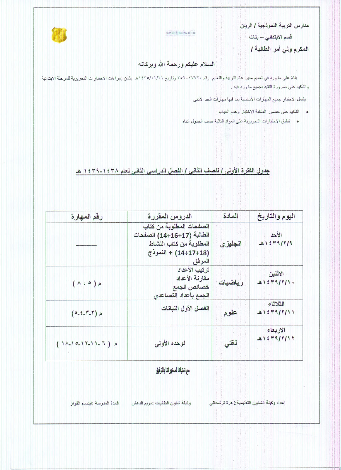 نموذج جدول اختبار doc 309 5 كيلوبايت المشاهدات 4231 سبحان الله وبحمده سبحان الله العظيم تابعناعلى تويتر من هنــــــــا. جدول سير اختبارات شهادة التعليم الابتدائي دورة ماي 2019 المواد التي يمتحن فيها التلاميذ هي. اختبارات السنة الاولى الثانية الثالثة الرابعة الخامسة ابتدائي متوسط ثانوي اللغة العربية التربية الاسلامية الرياضيات التربية العلمية التربية المدنية التاريخ الجغرافيا اللغة الفرنسية التربية الفنية و. نماذج اختبار الفترة الاولى لغتي الثالث الابتدائي الفصل الاول 1441 هـ 2020 م للتحميل المباشر المجاني لكل من يرغب في الحصول عليها بسهولة ويسر.